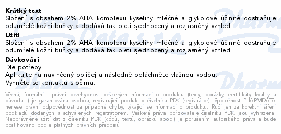 Složení s obsahem 2% AHA komplexu kyseliny mléčné a glykolové účinně odstraňuje odumřelé kožní buňky a dodává tak pleti sjednocený a rozjasněný vzhled.