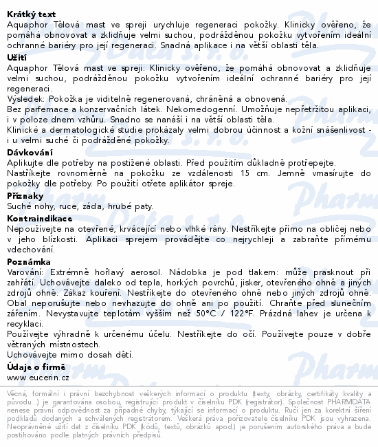 Aquaphor Tělová mast ve spreji urychluje regeneraci pokožky. Klinicky ověřeno, že pomáhá obnovovat a zklidňuje velmi suchou, podrážděnou pokožku vytvořením ideální ochranné bariéry pro její regeneraci. Snadná aplikace i na větší oblasti těla.