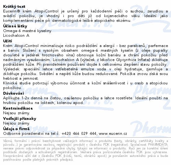 Eucerin® krém AtopiControl je určený pro každodenní péči o suchou, zarudlou a svědící pokožku, je vhodný i pro děti již od kojeneckého věku. Ideální jako komplementární péče při dermatologické léčbě atopického ekzému.