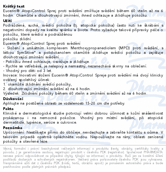 Eucerin® AtopiControl Sprej proti svědění zmířňuje svědění během 60 vteřin až na 6 hodin. Okamžité a dlouhotrvající zmírnění, ihned ochlazuje a zklidňuje pokožku.