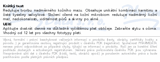 Redukuje tvorbu nadměrného kožního mazu. Obsahuje unikátní kombinaci karnitinu a čisté kyseliny salicylové. Složení cílené na kožní mikrobiom redukuje nadměrný kožní maz, nedokonalosti, viditelnost pórů a skvrny po akné.
