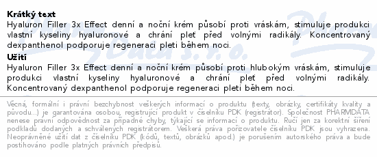 Hyaluron Filler 3x Effect denní a noční krém působí proti vráskám, stimuluje produkci vlastní kyseliny hyaluronové a chrání pleť před volnými radikály. Koncentrovaný dexpanthenol podporuje regeneraci pleti během noci.
