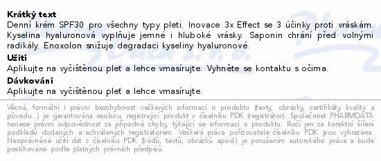 Denní krém SPF30 pro všechny typy pleti. Inovace 3x Effect se 3 účinky proti vráskám. Kyselina hyaluronová vyplňuje jemné i hluboké vrásky. Saponin chrání před volnými radikály. Enoxolon snižuje degradaci kyseliny hyaluronové.