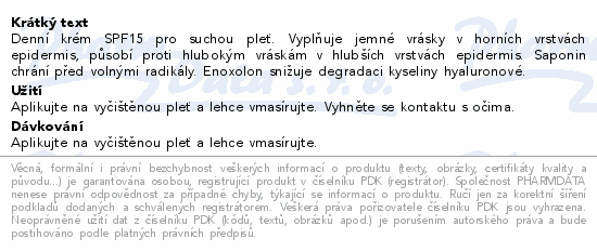Denní krém SPF15 pro suchou pleť. Vyplňuje jemné vrásky v horních vrstvách epidermis, působí proti hlubokým vráskám v hlubších vrstvách epidermis. Saponin chrání před volnými radikály. Enoxolon snižuje degradaci kyseliny hyaluronové.