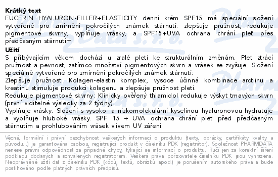 EUCERIN HYALURON-FILLER+ELASTICITY denní krém SPF15 má speciální složení vytvořené pro zmírnění pokročilých známek stárnutí: zlepšuje pružnost, redukuje pigmentové skvrny, vyplňuje vrásky, a SPF15+UVA ochrana chrání pleť přes předčasným stárnutím.