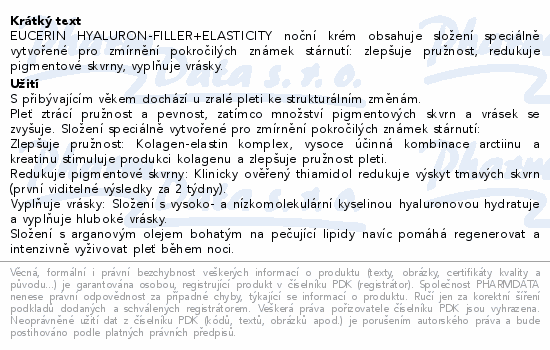 EUCERIN HYALURON-FILLER+ELASTICITY noční krém obsahuje složení speciálně vytvořené pro zmírnění pokročilých známek stárnutí: zlepšuje pružnost, redukuje pigmentové skvrny, vyplňuje vrásky.