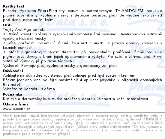 Eucerin Hyalluron-Filler+Elasticity sérum s patentovaným THIAMIDOLEM redukuje pigmentové skvrny, vyplňuje vrásky a zlepšuje pružnost pleti. Je vhodné jako základ pod denní nebo noční krém.