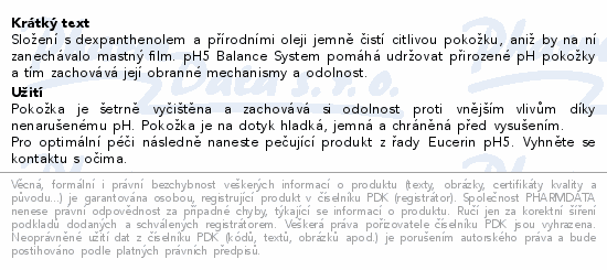 Složení s dexpanthenolem a přírodními oleji jemně čistí citlivou pokožku, aniž by na ní zanechávalo mastný film. pH5 Balance System pomáhá udržovat přirozené pH pokožky a tím zachovává její obranné mechanismy a odolnost.
