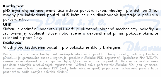 pH5 mycí olej na ruce jemně čistí citlivou pokožku rukou, vhodný i pro děti od 3 let, vhodný pro každodenní použití. pH5 krém na ruce dlouhodobě hydratuje a pečuje o pokožku rukou.