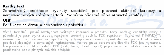 Zdravotnický prostředek vyvinutý speciálně pro prevenci aktinické keratózy a nemelanomových kožních nádorů. Podpůrná přídatná léčba aktinické keratózy.