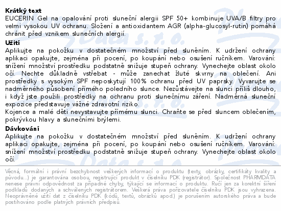 EUCERIN Gel na opalování proti sluneční alergii SPF 50+ kombinuje UVA/B filtry pro velmi vysokou UV ochranu. Složení a antioxidantem AGR (alpha-glucosyl-rutin) pomáhá chránit před vznikem slunečních alergií.