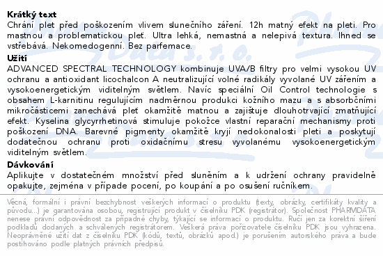 Chrání plet před poškozením vlivem slunečního záření. 12h matný efekt na pleti. Pro mastnou a problematickou pleť. Ultra lehká, nemastná a nelepivá textura. Ihned se vstřebává. Nekomedogenní. Bez parfemace.