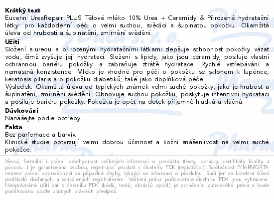 Eucerin UreaRepair PLUS Tělové mléko 10% Urea + Ceramidy & Přirozené hydratační látky: pro každodenní péči o velmi suchou, svědící a šupinatou pokožku. Okamžitá úleva od hrubosti a šupinatění, zmírnění svědění.