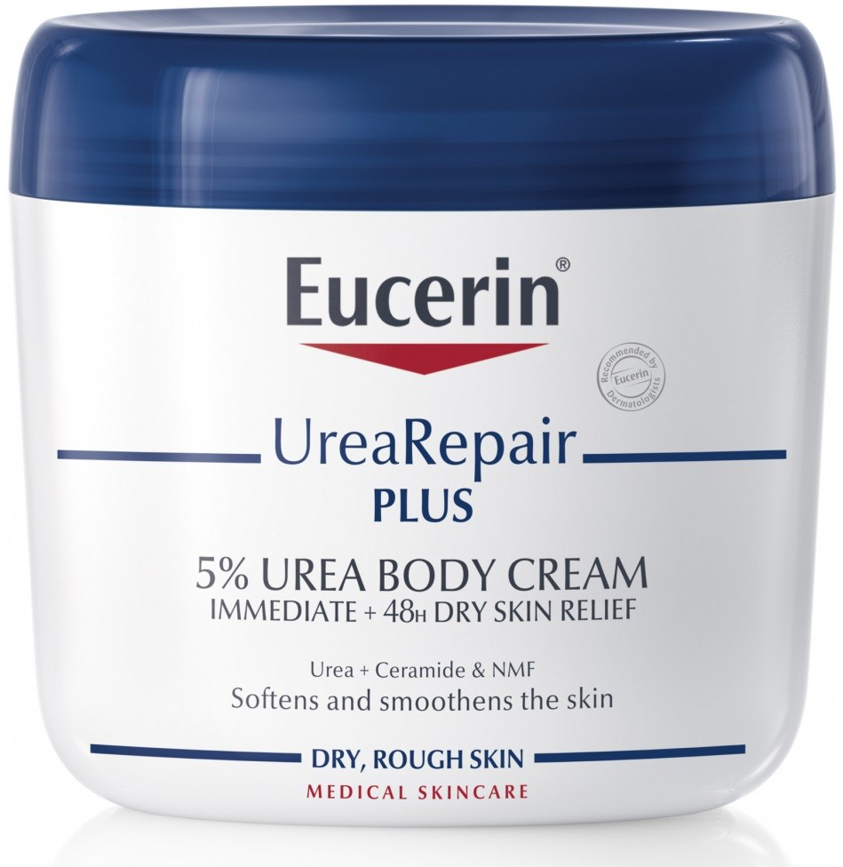 Eucerin UreaRepair PLUS tělový krém 5% Urea + Ceramidy & Přirozené hydratační látky: pro každodenní péči o velmi suchou pokožku. Bez parfemace a barviv.
