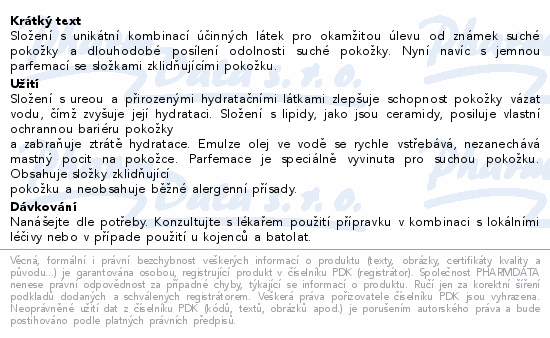 Složení s unikátní kombinací účinných látek pro okamžitou úlevu od známek suché pokožky a dlouhodobé posílení odolnosti suché pokožky. Nyní navíc s jemnou parfemací se složkami zklidňujícími pokožku.