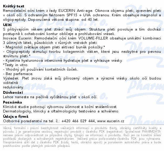 Remodelační oční krém z řady EUCERIN Anti-age. Obnova objemu pleti, zpevnění pleti v okolí očí. S ochranným faktorem SPF15 + UVA ochranou. Krém obsahuje magnolol a oligopeptidy. Doporučená věková skupina: od 40 let.