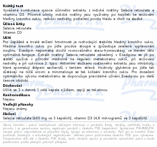 Vyvážená kombinace vysoce účinného extraktu z indické rostliny Salacia reticulata a vitaminu D3. Příznivé účinky indické rostliny jsou využívány po tisíciletí ke snižování hladiny krevního cukru, redukci nadváhy, potlačení pocitu hladu a chuti na sladké.