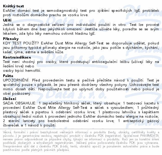 ExAller domácí test je samodiagnostický test pro zjištění specifických IgE protilátek proti roztočům domácího prachu ze vzorku krve.