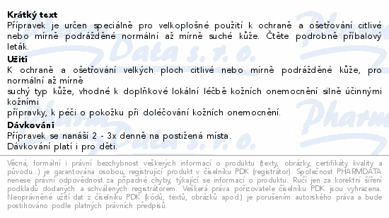 Přípravek je určen speciálně pro velkoplošné použití k ochraně a ošetřování citlivé nebo mírně podrážděné normální až mírně suché kůže. Čtěte pozorně příbalový leták.