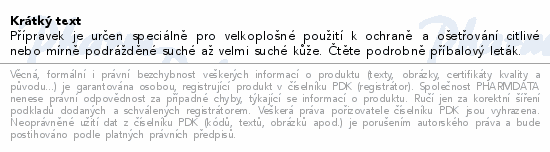 Přípravek je určen speciálně pro velkoplošné použití k ochraně a ošetřování citlivé nebo mírně podrážděné suché až velmi suché kůže. Čtěte pozorně příbalový leták.