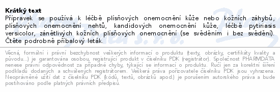 Přípravek se používá k léčbě plísňových onemocnění kůže nebo kožních záhybů, plísňových onemocnění nehtů, kandidových onemocnění kůže, léčbě pytiriasis versicolor, zánětlivých kožních plísňových onemocnění (se svěděním i bez svědění). Čtěte pozorně příbalový leták.