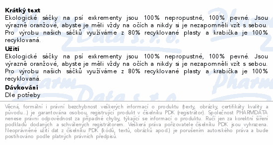 Ekologické sáčky na psí exkrementy jsou 100% nepropustné, 100% pevné. Jsou výrazně oranžové, abyste je měli vždy na očích a nikdy si je nezapomněli vzít s sebou. Pro výrobu našich sáčků využíváme z 80% recyklované plasty a krabička je 100% recyklovaná.