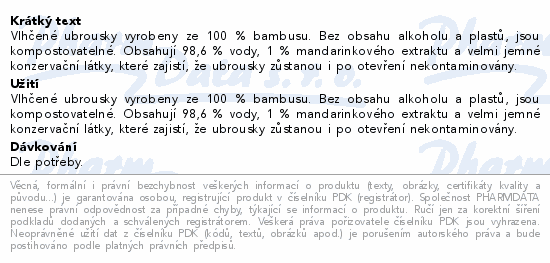 Vlhčené ubrousky vyrobeny ze 100 % bambusu. Bez obsahu alkoholu a plastů, jsou kompostovatelné. Obsahují 98,6 % vody, 1 % mandarinkového extraktu a velmi jemné konzervační látky, které zajistí, že ubrousky zůstanou i po otevření nekontaminovány.