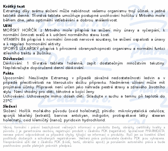 Extramag díky svému složení může nabídnout vašemu organismu trojí účinek v jedné tabletě denně. Třívrstvá tableta umožňuje postupné uvolňování hořčíku z Mrtvého moře během dne, jeho optimální vstřebávání a dobrou snášenlivost.