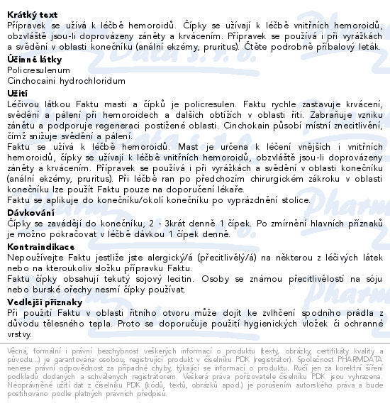 Faktu se používá k místní léčbě hemoroidů. Mast je určena k léčbě vnějších i vnitřních hemoroidů, čípky se používají k léčbě vnitřních hemoroidů, obzvláště jsou-li doprovázeny zánětem a krvácením. Přípravek Faktu se dále používá při vyrážkách a svědění v oblasti konečníku a u povrchních trhlin v oblasti řitního otvoru.