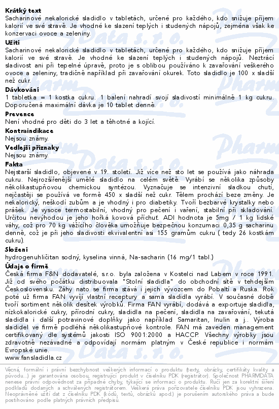 Sacharinové nekalorické sladidlo v tabletách, určené pro každého, kdo snižuje příjem kalorií ve své stravě. Je vhodné ke slazení teplých i studených nápojů, zejména však ke konzervaci ovoce a zeleniny.