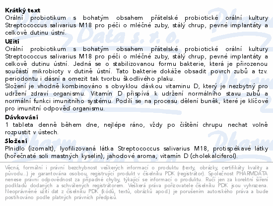 Orální probiotikum s bohatým obsahem přátelské probiotické orální kultury Streptococcus salivarius M18 pro péči o mléčné zuby, stálý chrup, pevné implantáty a celkově dutinu ústní.