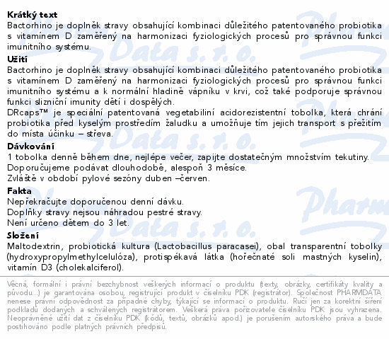 Bactorhino je doplněk stravy obsahující kombinaci důležitého patentovaného probiotika s vitamínem D zaměřený na harmonizaci fyziologických procesů pro správnou funkci imunitního systému.