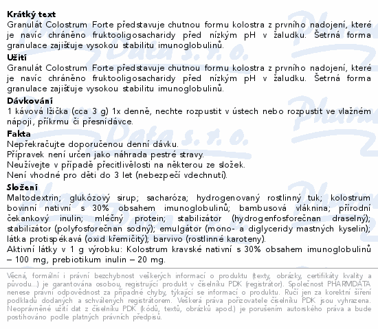 Granulát Colostrum Forte představuje chutnou formu kolostra z prvního nadojení, které je navíc chráněno fruktooligosacharidy před nízkým pH v žaludku. Šetrná forma granulace zajišťuje vysokou stabilitu imunoglobulinů.