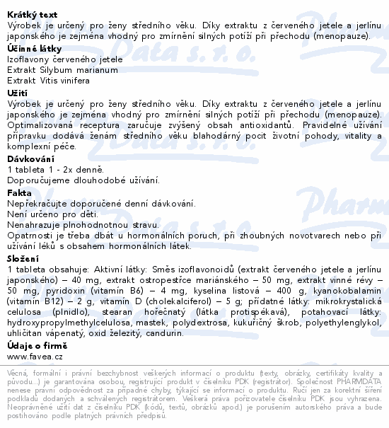 Výrobek je určený pro ženy středního věku. Díky extraktu z červeného jetele a jerlínu japonského je zejména vhodný pro zmírnění silných potíží při přechodu (menopauze).