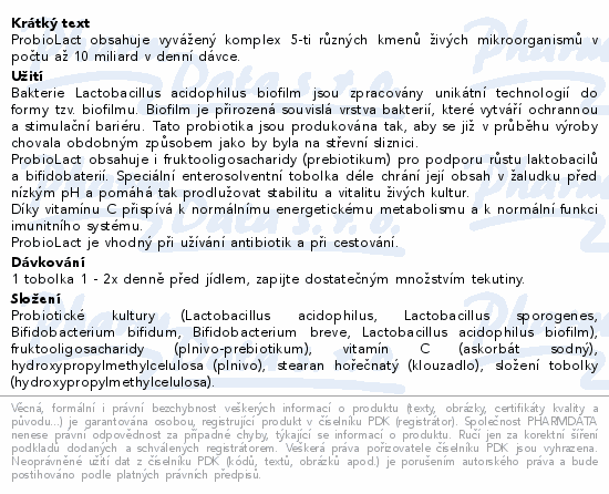 ProbioLact obsahuje vyvážený komplex 5-ti různých kmenů živých mikroorganismů v počtu až 10 miliard v denní dávce.