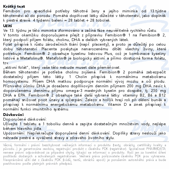 Femibion pro specifické potřeby těhotné ženy a jejího miminka od 13.týdne těhotenství až do porodu. Pomáhá doplňovat látky důležité v těhotenství, jako doplněk k pestré stravě. 4 týdenní balení = 28 tablet + 28 tobolek.