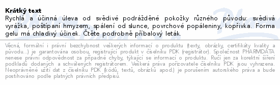 Rychlá a účinná úleva od svědivé podrážděné pokožky různého původu: svědivá vyrážka, poštípaní hmyzem, spálení od slunce, povrchové popáleniny, kopřivka. Forma gelu má chladivý účinek. Čtěte pozorně příbalový leták.
