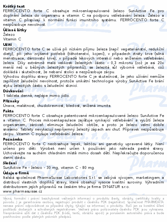 FERROCENTO forte C obsahuje mikroenkapsulované železo SunActive Fe pro doplnění železa do organismu a vitamin C na podporu vstřebávání železa. Železo a vitamin C přispívají k normální funkci imunitního systému. FERROCENTO forte C nezpůsobuje nevolnost.