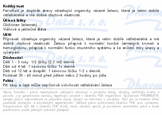 Ferrofruit je doplněk stravy obsahující organicky vázané železo, které je velmi dobře vstřebatelné a má dobré chuťové vlastnosti.