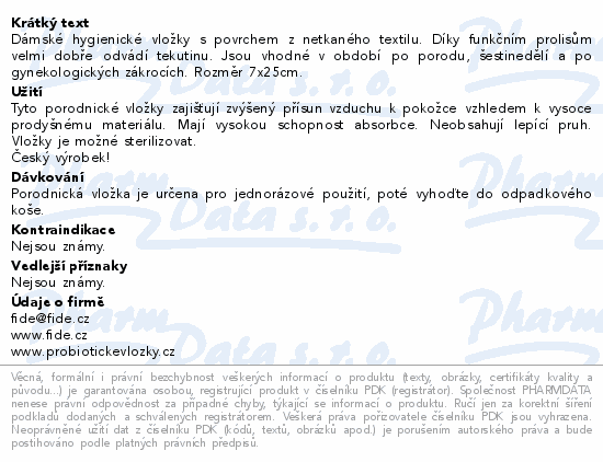 Dámské hygienické vložky s povrchem z netkaného textilu. Díky funkčním prolisům velmi dobře odvádí tekutinu. Jsou vhodné v období po porodu, šestinedělí a po gynekologických zákrocích. Rozměr 7x25cm.