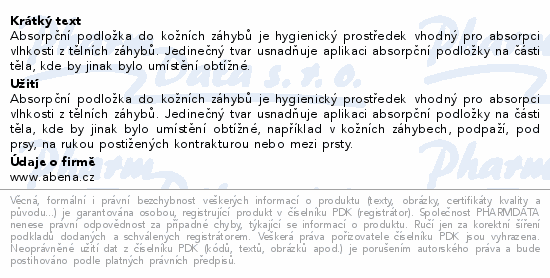 Absorpční podložka do kožních záhybů je hygienický prostředek vhodný pro absorpci vlhkosti z tělních záhybů. Jedinečný tvar usnadňuje aplikaci absorpční podložky na části těla, kde by jinak bylo umístění obtížné.