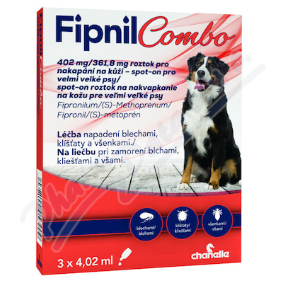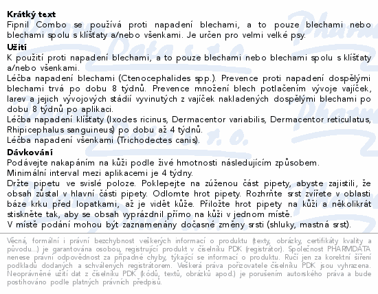 Fipnil Combo se používá proti napadení blechami, a to pouze blechami nebo blechami spolu s klíšťaty a/nebo všenkami. Je určen pro velmi velké psy.