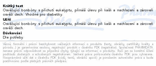Osvěžující bonbóny s příchutí eukalyptu, přináší úlevu při kašli a nachlazení a zároveň osvěží dech. Vhodné pro diabetiky.