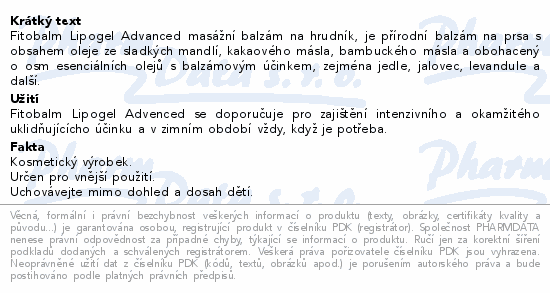 Fitobalm Lipogel Advanced masážní balzám na hrudník, je přírodní balzám na prsa s obsahem oleje ze sladkých mandlí, kakaového másla, bambuckého másla a obohacený o osm esenciálních olejů s balzámovým účinkem, zejména jedle, jalovec, levandule a další.