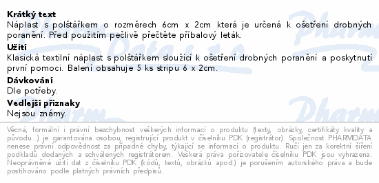 Náplast s polštářkem o rozměrech 6cm x 2cm která je určená k ošetření drobných poranění. Před použitím pečlivě přečtěte příbalový leták.