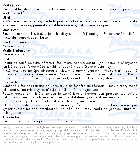 Pinzeta Alfa, která je určena k lehkému a spolehlivému odstranění klíštěte přisátého kdekoliv na kůži.