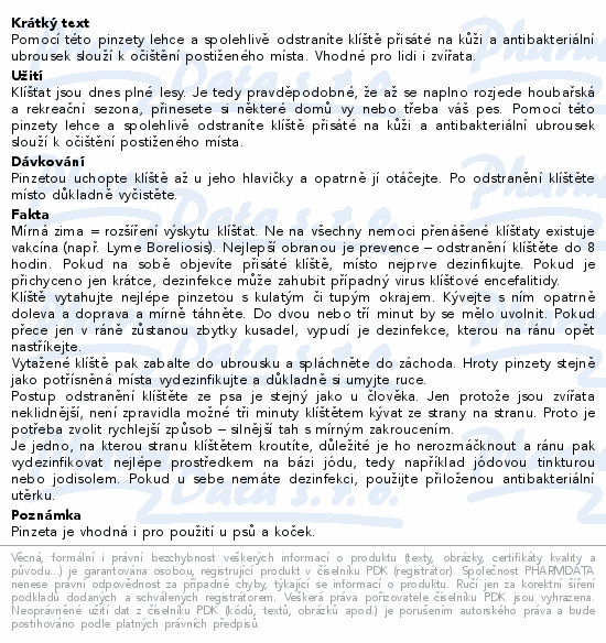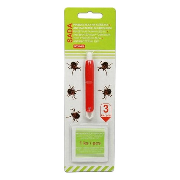 Pomocí této pinzety lehce a spolehlivě odstraníte klíště přisáté na kůži a antibakteriální ubrousek slouží k očištění postiženého místa. Vhodné pro lidi i zvířata.