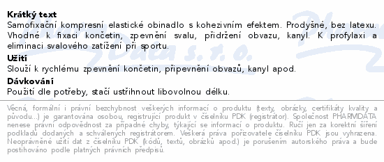 Samofixační kompresní elastické obinadlo s kohezivním efektem. Prodyšné, bez latexu. Vhodné k fixaci končetin, zpevnění svalu, přidržení obvazu, kanyl. K profylaxi a eliminaci svalového zatížení při sportu.