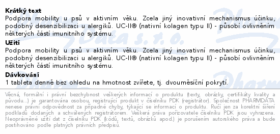 Podpora mobility u psů v aktivním věku. Zcela jiný inovativní mechanismus účinku, podobný desenzibilizaci u alergiků. UC-II® (nativní kolagen typu II) - působí ovlivněním některých částí imunitního systému.