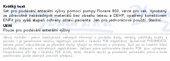 Set pro podávání enterální výživy pomocí pumpy Flocare 800, verze pro vak. Vyrobený ze zdravotně nezávadných materiálů bez obsahu latexu a DEHP, opatřený konektorem ENFit pro vyšší stupeň ochrany zdraví pacienta. Jen pro jednorázové použití. Sterilní.